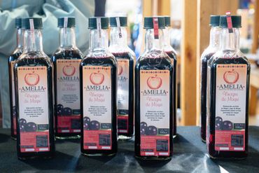 Vinagres de manzana y de maqui, orgánicos, ricos en probióticos, elaborados con respeto al medio ambiente y a las tradiciones del pueblo mapuche, trae desde la localidad de El Alma, en la comuna de Puerto Saavedra, Amelia Paillalef, cuya razón de vida es llegar a las casas con productos sanos.